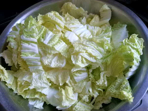 切大白菜,白菜帮要片薄片,白菜帮和白菜叶分开放。