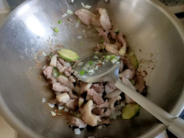 热锅凉油先煸透五花肉后下葱姜,加一点点酱油上色。