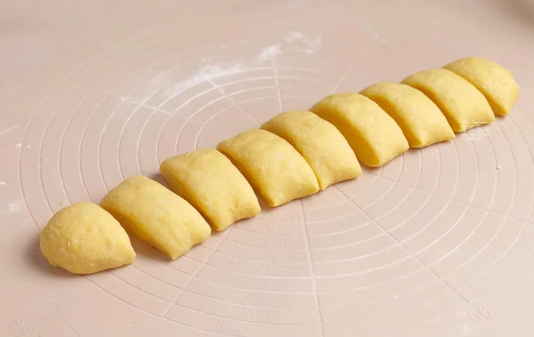 醒发好的面团揉匀排气后揉成长条状,分成9个差不多等量的小剂子;