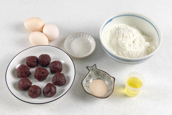 准备食材和工具:3个鸡蛋、4克酵母粉、10克白糖、250克面粉、20ml植物油、装饰白糖适量、豆沙馅9个 鹅妈妈钛晶锅