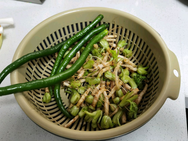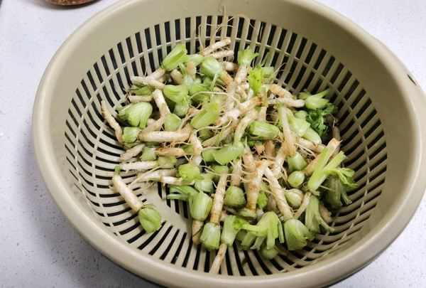 香菜根剔去毛根,大点的从中间切一刀,蒜、姜适量、花椒几粒加入。
