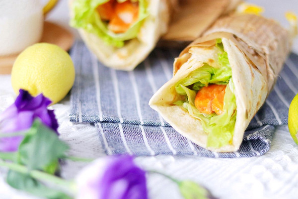 早上起床,拿出一张饼放在平底锅里中小火煎,放不放油都可以。然后打上一个鸡蛋,洗几片生菜,再放上鸡胸肉/火腿肠等喜欢的材料,卷起来就可以开吃啦!