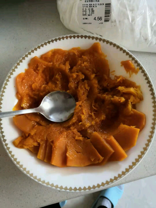 把糯米粉加进去,和成面团。 这里喜欢甜的可以加糖 我没有放糖,南瓜的甜味已经很足了 这个可以根据自己的口味调节