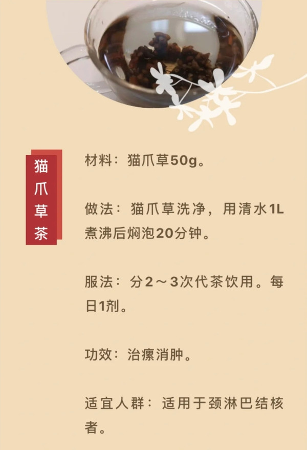 做法:猫爪草洗净,用清水1L煮沸后焖泡20分钟。