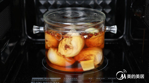 鸡腿放入大而深的微波炉适用深碗中,加入没过鸡腿的清水,放入所有调料,加盖留孔放入微波炉中,先微波高火加热7分钟,然后接着转微波中火再加热15分钟。