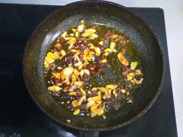 锅中留少许底油,放豆瓣酱一勺,葱蒜,煸炒出香味