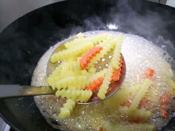 土豆、青笋、胡萝卜切狼牙状,清洗后,下油锅先炸土豆和红萝卜(也可用水煮)