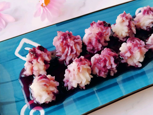 一道好看又好吃的蓝莓山药泥就做好了,是不是超级简单?如果家里没有裱花嘴,可以直接放入盘子中,淋上蓝莓酱就可以。