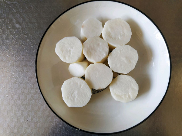 将山药洗净,去皮,切成小块,放入盘中备用。山药去皮的时候一定要记得带上手套,避免山药的黏液弄到手上,引起手部不适。