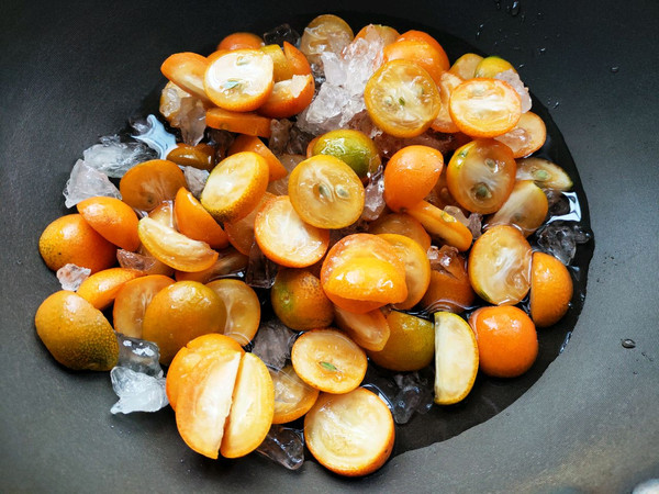 把腌制好的金桔和冰糖放无油的干净锅里面,加200克清水烧开。