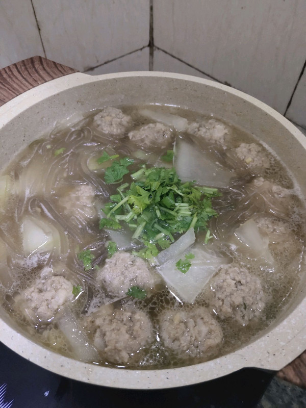 起锅开火,放入冬瓜和水,水开以后,放入粉丝,再把搓成的丸子放入锅中