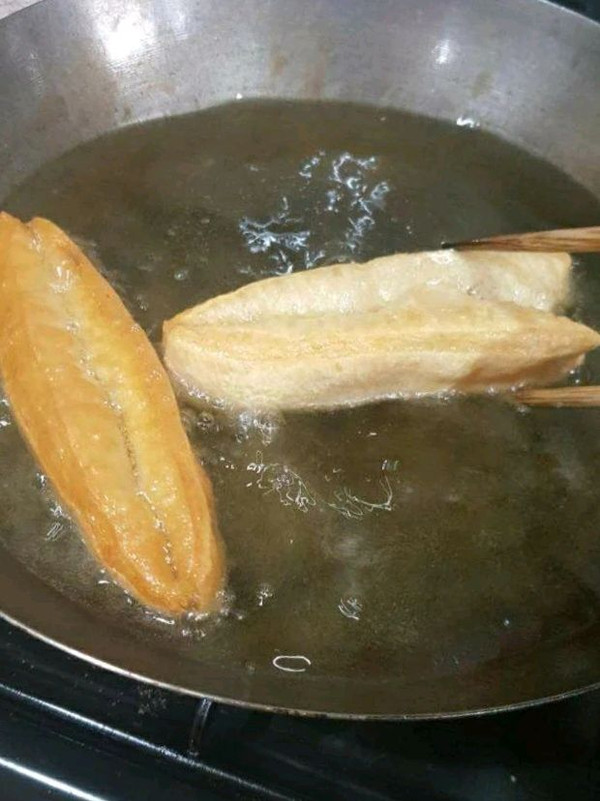 早上起来,放置30分钟后,切面剂子,用筷子从中间压一下,抻面一下。放入180度°油温,炸制。