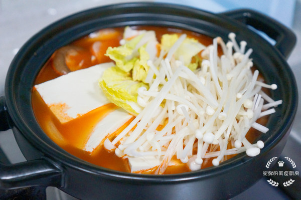 再放入豆腐、金针菇、娃娃菜煮至菜变软。