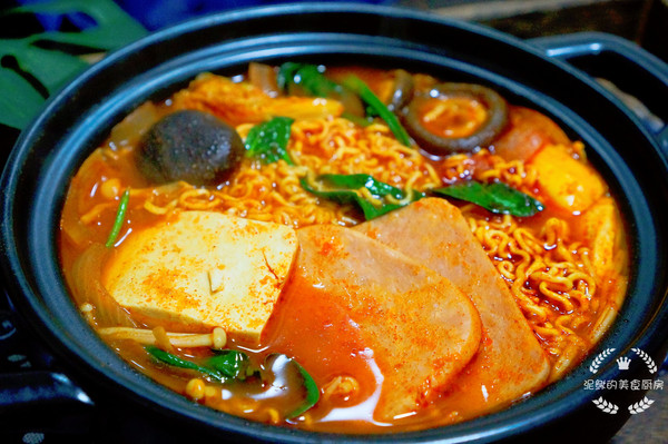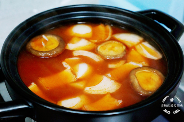 砂锅中放入适量的水,倒入一袋韩式火锅专用酱。