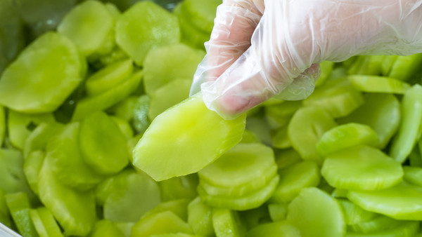 全部处理好后我们再用清水洗一遍,然后改刀切片,可以稍微厚点,但一定不要切太薄了,厚度切的均匀一些,比较细的地方斜着切,都切好后我们给它装进来;