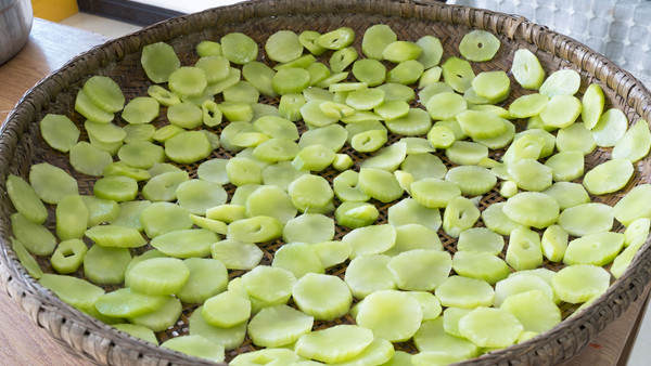 晒干以后的莴笋干变得非常的薄了,所以切的时候完全不用担心是不是切的太厚,晒过以后都会收缩变薄,如果一开始就切的特别薄,晒干以后就微乎其微了;