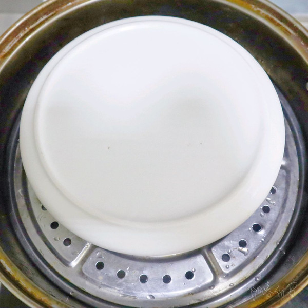 碗上面扣盘子,盖上锅盖,水开后计时蒸8-10分钟,焖3分钟