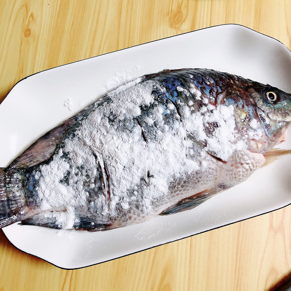 将腌制好的鱼,汤汁倒掉,抹上一层淀粉。