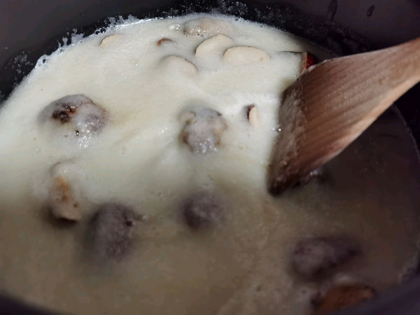 开中小火,慢慢熬,起初不需要搅拌。可以在一边清洗整理用过的容器。