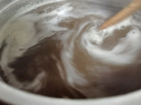 舀一勺在温水里,不轻易融化,需要搅拌。