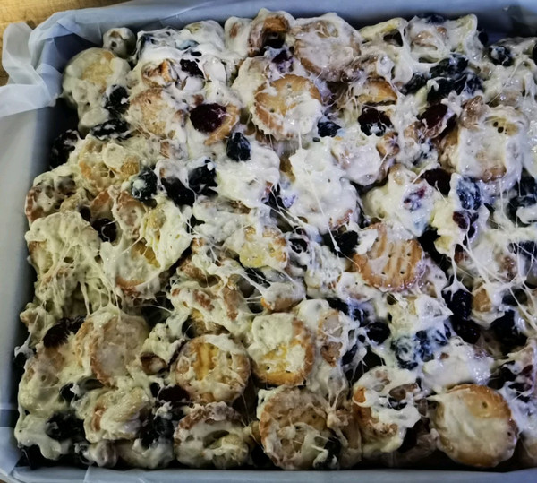 腰果,饼干,蔓越莓和黑加仑提前掺在一起,倒入搅拌好的棉花糖里,关火翻拌,让食材都裹上棉花糖液。放模具里后我觉得还是不太匀,又戴了手套手工拉扯,翻拌。天冷,怕凉了不好定型,就没重新拍照。手工拉扯的时候不要太用力按压,怕饼干太碎不好吃。