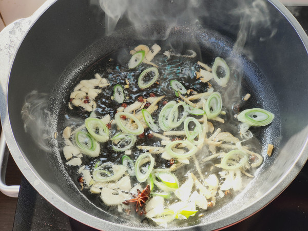 下姜丝、蒜末、花椒、八角爆香。