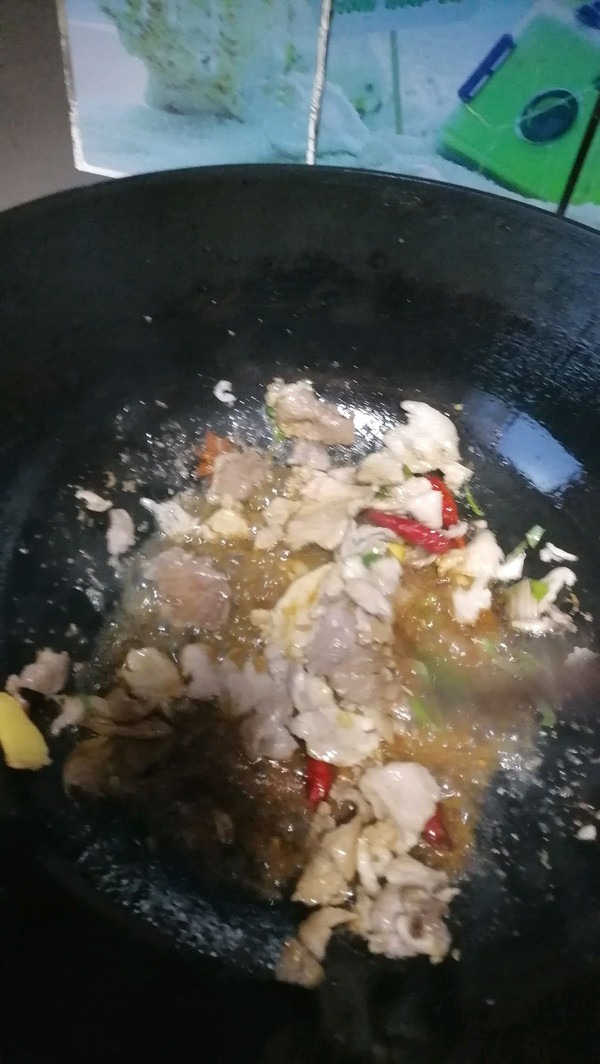 热锅凉油适量猪油和植物油,油热后炒香姜片儿和葱花,放入干辣椒,八角,然后加入肉片翻炒至变色,加一勺一品鲜炒匀。