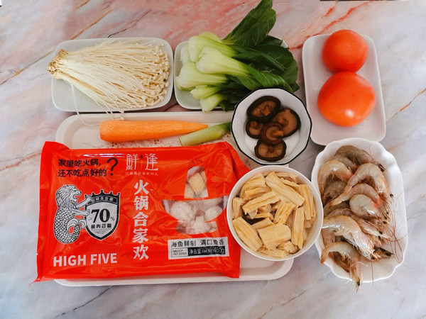 鲜逢火锅合家欢内有5种食材:鱼丸、龙虾味球、鱼柱、蟹味棒和爱心鱼豆腐,海鱼鲜制鲜味十足。