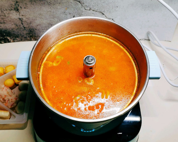 依次放入鲜逢火锅合家欢食材:这是龙虾味球。