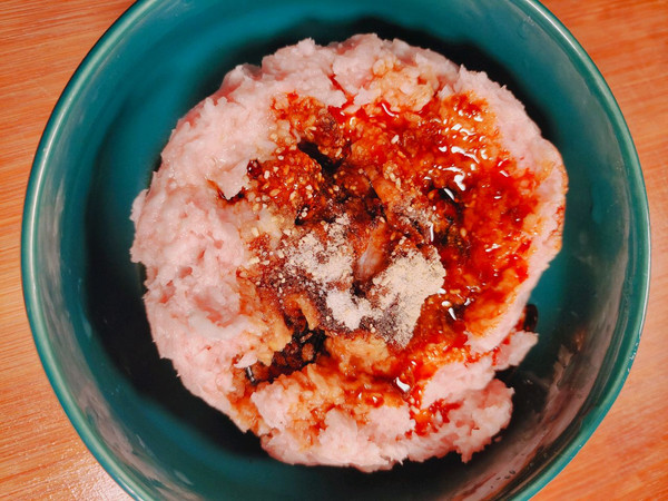 肉末加,盐,味精,胡椒粉,蒜末,姜末,淀粉,料酒,生抽搅拌均匀