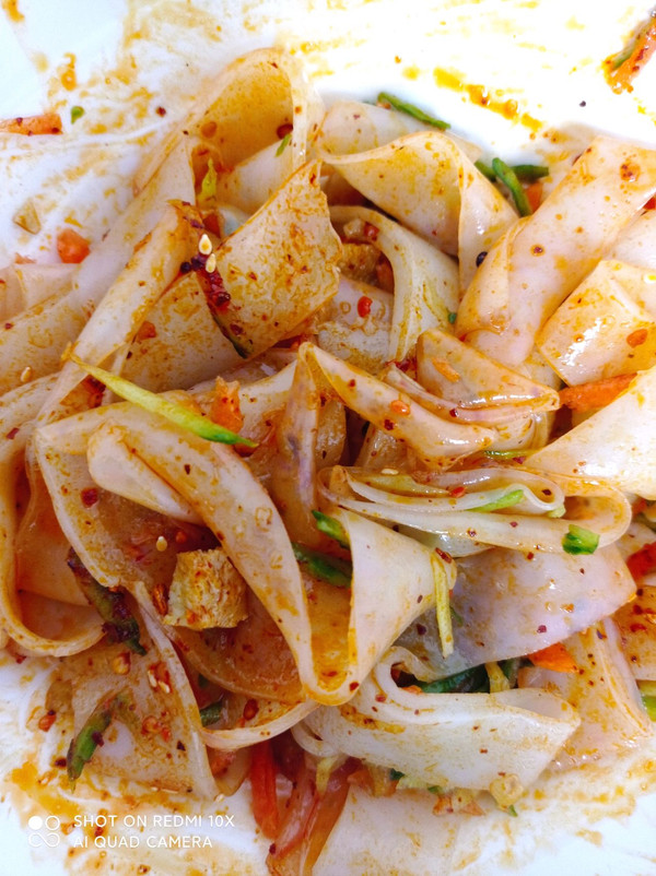 做好的凉皮切成条,加入黄瓜丝,胡萝卜丝,面筋,花生米,辣椒油,翻拌均匀就可以享受美味啦!
