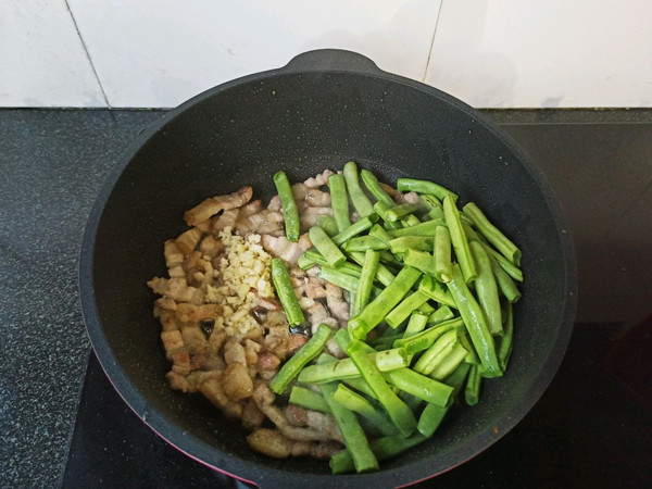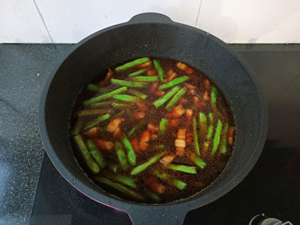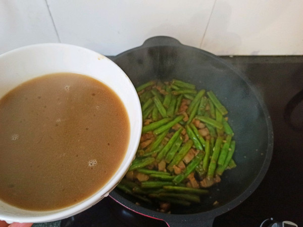 5分钟后把剩余的汤汁倒出备用。四季豆和肉留在锅底。
