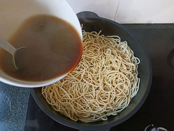 四季豆和肉上面铺上面条,把汤汁均匀的淋在面条上。