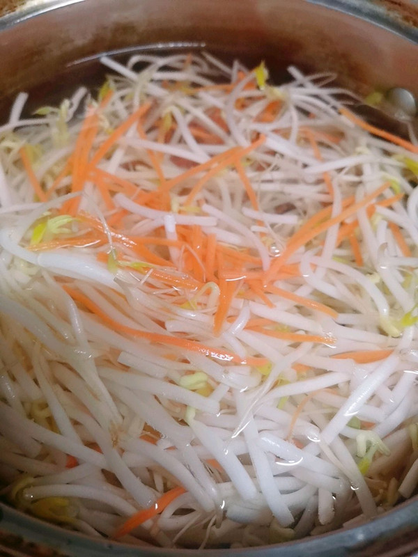胡萝卜切丝和绿豆芽一起焯水过凉!控干水分