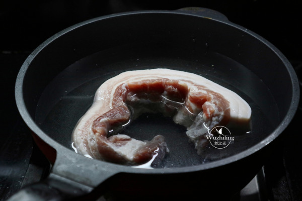 首先,将五花肉洗干净,表面的细毛要用刀刮下,然后放入冷水锅里面加入少许的料酒煮开,捞出来洗干净。