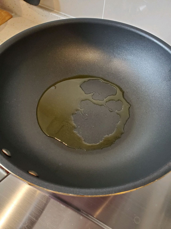 然后热锅,加入两勺橄榄油,直到开始起泡或发出渍渍渍的声响时,用锅铲将热油取出(一定小心高温喷溅,注意安全⊙∀⊙)