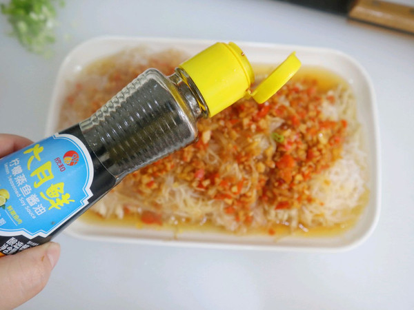蒸好以后淋上蒸鱼酱油,撒上小香葱