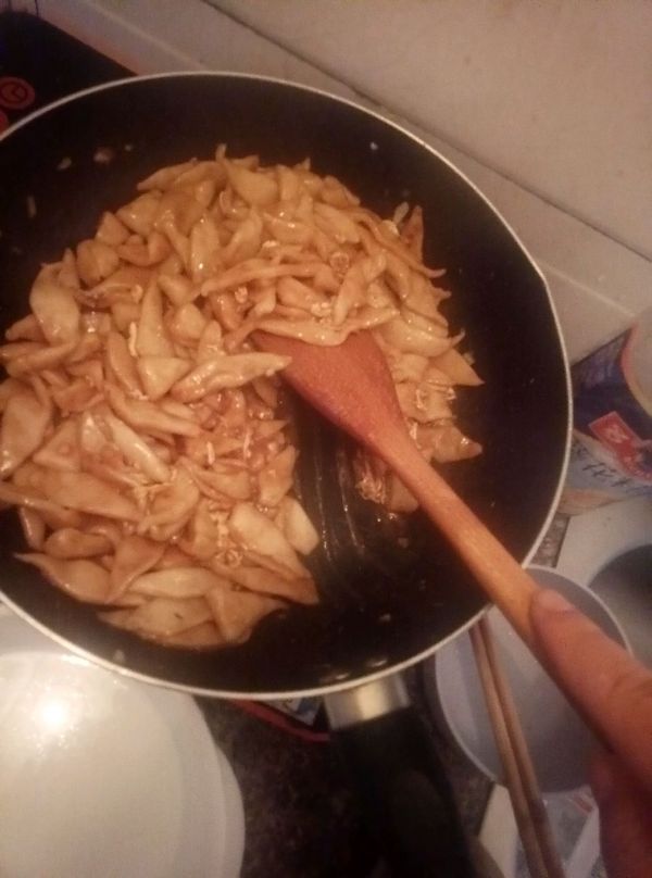 水开下锅,搅散,防止粘连锅底,煮熟捞出过水,起锅烧油,下鸡蛋炒散,下蒜粒,下斜斜翻炒,下麻辣鲜,酱油,盐,翻炒,个人喜欢湿点,略加水,出锅