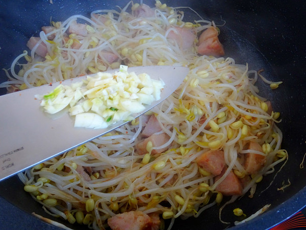 看到豆芽完全塌软,就放入切碎的蒜瓣翻炒均匀出锅。