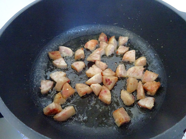 首先,锅内放一勺食用油,不要多,直接把火腿煎一下,煎变色,有点出油的状态。