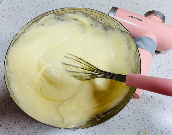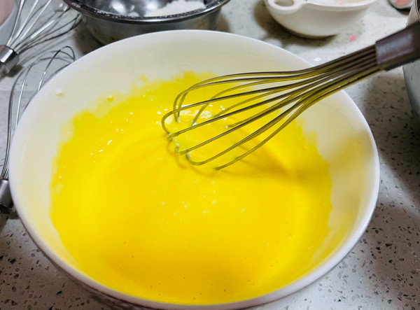 开始打发蛋白,在打发过程中,分次加入白糖。
