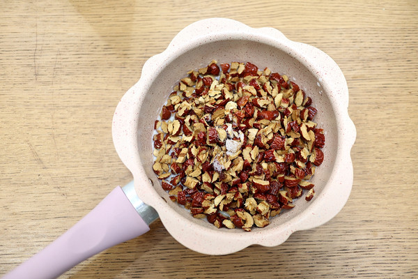 红枣肉、牛奶同入小锅;牛奶的用量虽然不多,但能增加枣糕的营养并被人体所吸收利用;
