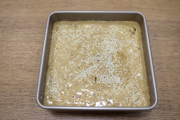 如果模具是新的,可将蛋糊直接倒入模具中;如果模具用过几次,在模具底部铺张油纸更利于脱模;蛋糕糊倒入8寸固底模具中,表面撒生的白芝麻;