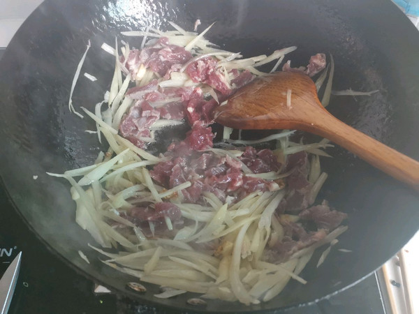 准备食材 牛肉切条生姜切丝(一定是那种嫩黄色水汪汪有红色的皮的新生姜)