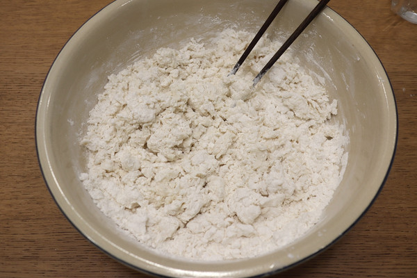 另一半面粉中倒入室温凉水,用筷子搅拌成絮状,再将二者混合搅拌;