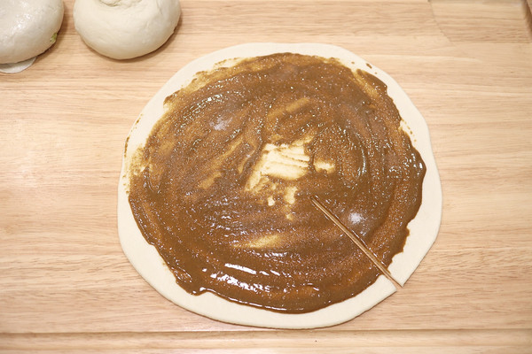 将其中一份擀成直径约25公分的圆片,抹上油酥,切比半径略短的一刀;