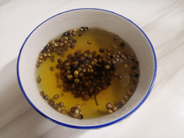 这个花椒水要提前加热水泡好,半把花椒粒加多半碗开水浸泡,水凉了就可以用来调馅