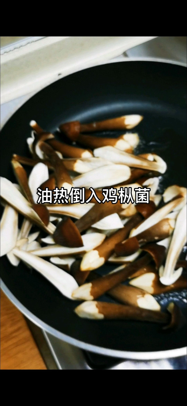 鸡枞菌对切改刀,用热水炒过,黄瓜苗洗净