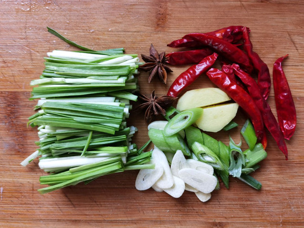 准备好的葱,蒜,姜,小树椒,蒜苗,切好备用。