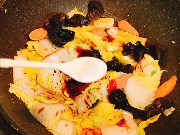 加入白菜火腿木耳炒至白菜炒软